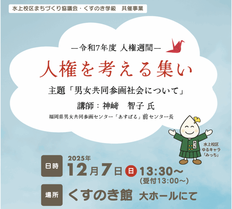 「水上校区将来ビジョン」とは、校区の現状と課題を踏まえ、10年後の将来像を明らかにし、その将来像を実現するための校区づくりの基本計画を整理したものです。このビジョンは、全世帯を対象としたアンケート調査を始め、水上校区まちづくり協議会委員によるご意見などを参考に策定しました。このビジョンでは、水や大楠林に代表される豊かな自然環境を十分に活かした地域づくりを目標に掲げ、「みんなで協力し、みんなで支え合う校区」を目指します。次世代を担う子どもたちのために